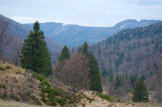Picture of conifer trees, from the Ceahlau Massif forests