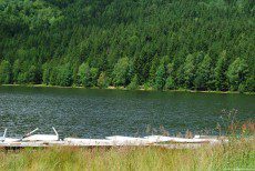 Picture of the Bicaz Lake surrounded by coniferous woods