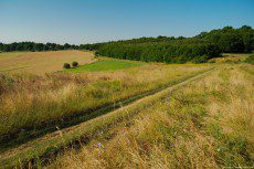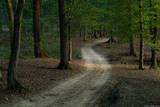 Image of a forest drive on fall, which sneaks between the thin and tall fir trunks, bathed in the elongated sunset rays. The grass from the road sides is dried