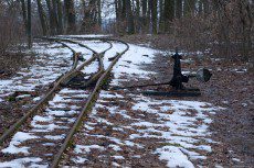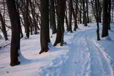 Image of a road on snow in a white forest. In the background a cluster of evergreen firs, is lighted with the tired sunlight just before sunset.