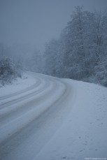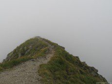 Picture of a mountain trail that disappears into the snowy athmosfere
